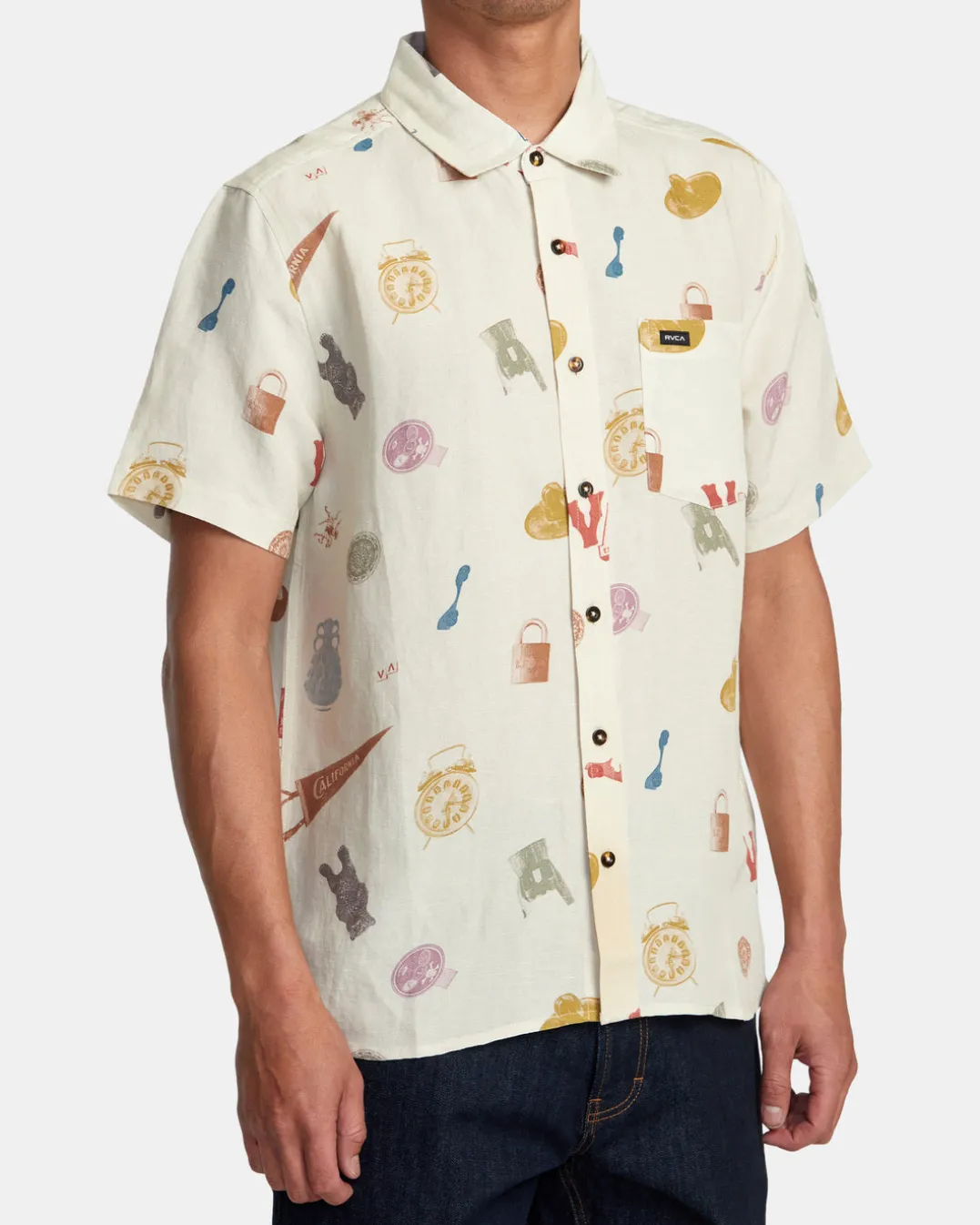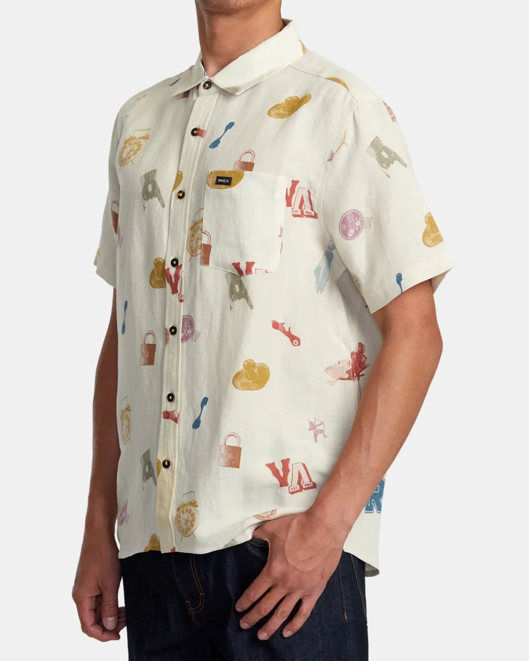 Step out in style with RVCA’s Artifacts Short Sleeve Woven Shirt. Crafted from a lightweight linen-viscose blend fabric in a slightly relaxed fit for easy wear, this printed button-up shirt features a traditional collar neck, a single chest pocket, and a scalloped hem for an elevated look. Featured here in the Natural colorway.