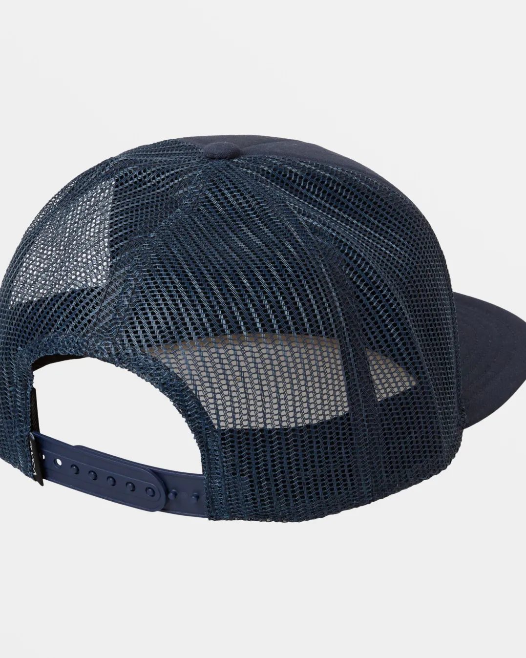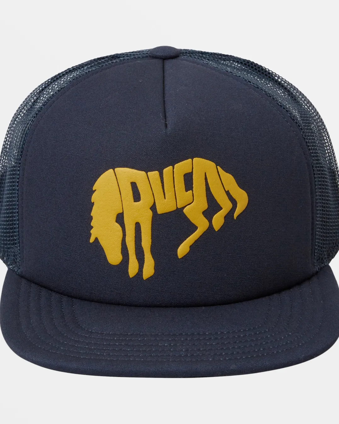 Raised RVCA embroidery adds an eye-catching element to the Buck Trucker hat, a classic mesh-backed cap with a flat brim and adjustable snapback closure. Featured here in the Navy colorway.