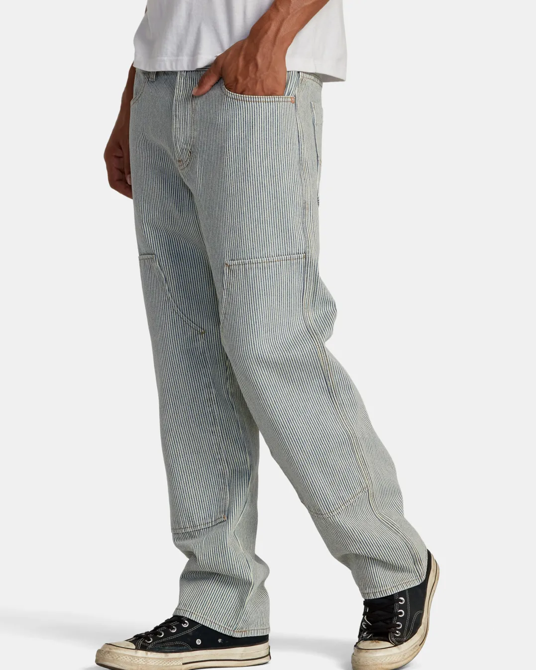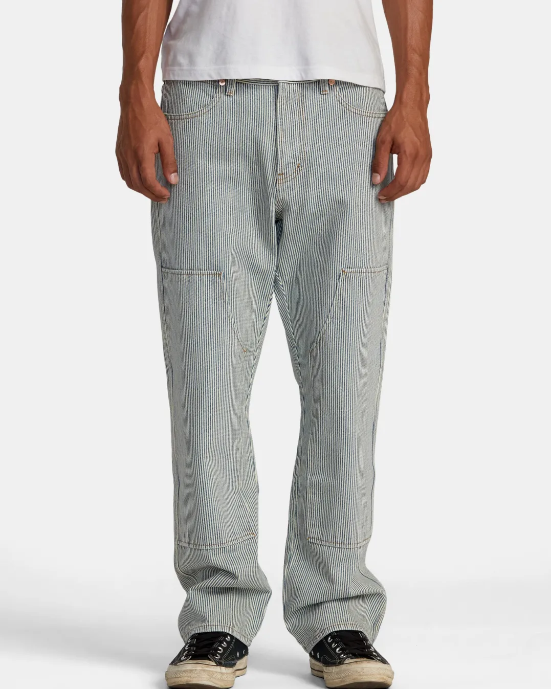 The Chainmail denim pants feature a casual relaxed fit with a fixed waist, faux fly, and button closure for easy comfort. The cotton fabric has been stonewashed and distressed using an enzyme process, giving these pants a broken-in, vintage look perfect for a laid-back day.