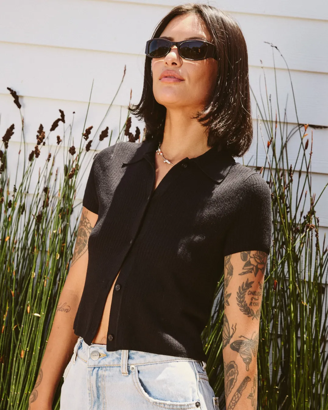 A cozy yet stylish polo sweater made from soft viscose-nylon yarns for all-day comfort and wearability. The collar neck and short sleeves give it a casual yet put-together look, while the button closure adds a touch of retro charm. Featured here in the Black colorway.