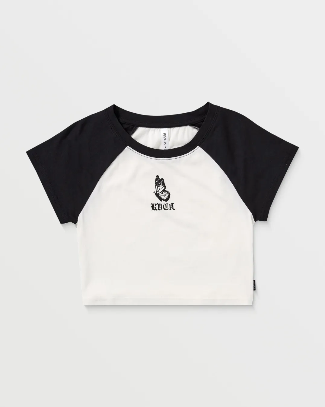 Crafted of mid-weight cotton that only gets softer with each wear, this super-cropped raglan tee features a mini chest graphic and a ribbed crewneck. Featured here in the Rvca Black colorway.
