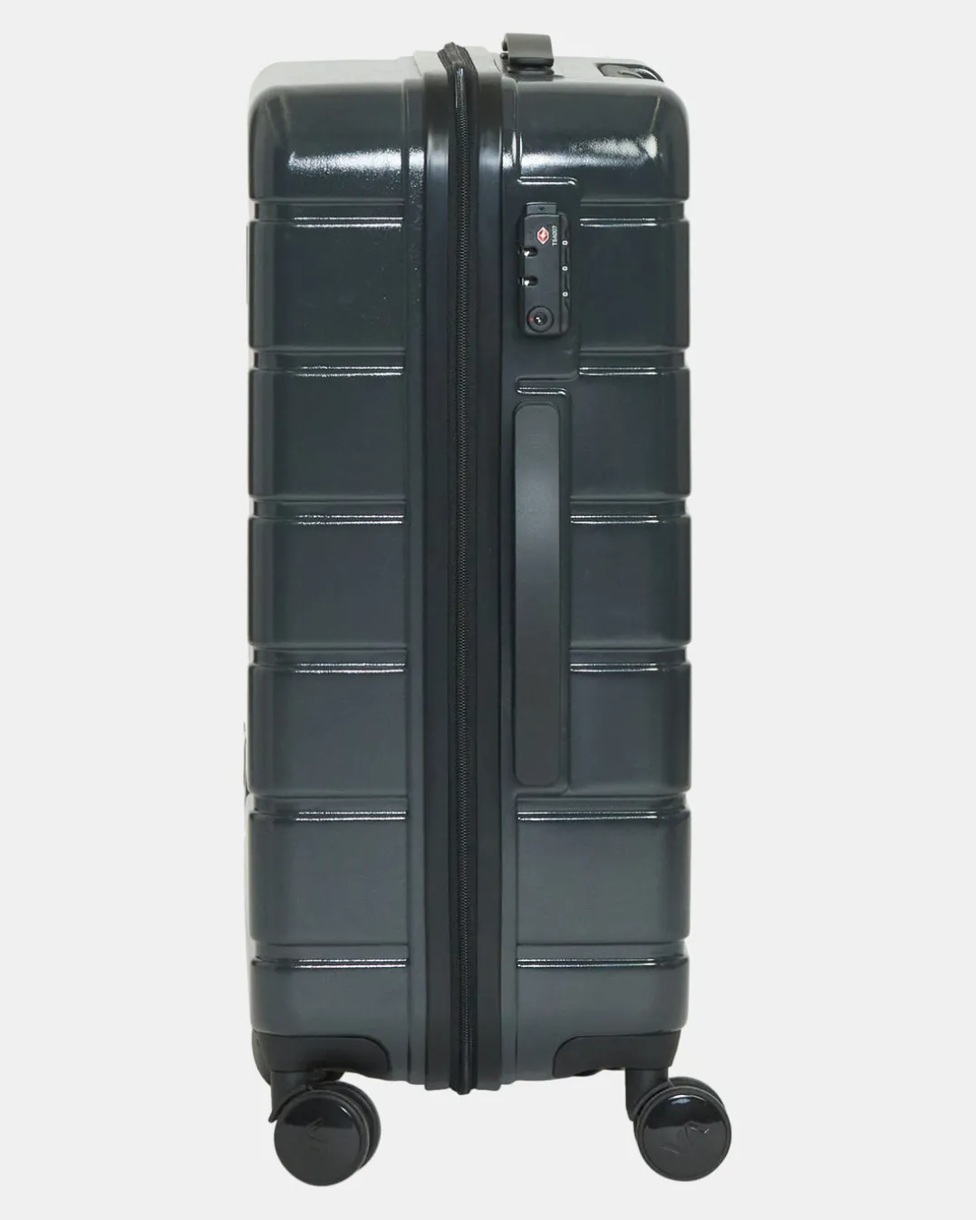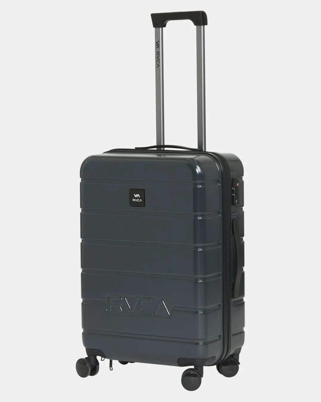 The RVCA VA Medium Roller Hardcase Suitcase features a durable hard outer shell, poly lined interior, dual wraparound zipper closure with a combination lock entry for ultimate security. Built with an ergonomic top handle, 360-degree spinner wheels, and topped with RVCA branding throughout. Featured here in the Black colorway.