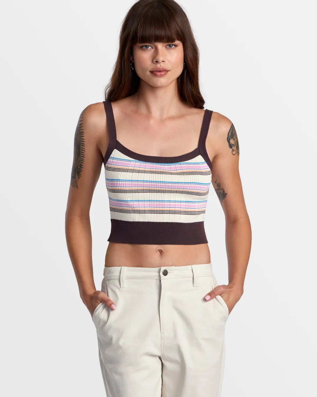 Add some texture to your warm-weather look with RVCA Women’s Tatum Sweater Tank Top. Made of cotton, this fitted tank features a square neckline and a variegated rib design. Featured here in the New Plum colorway.