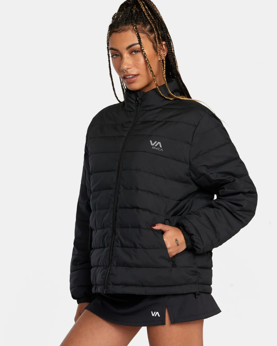 Waterproofed and super warm, RVCA Women’s VA Puffer Jacket is made of durable taffeta fabric with a packable hood, full zip closure, two pockets and a VA print at the chest. Elevate your outerwear collection with this timeless cold-weather style. Featured here in the Black colorway.