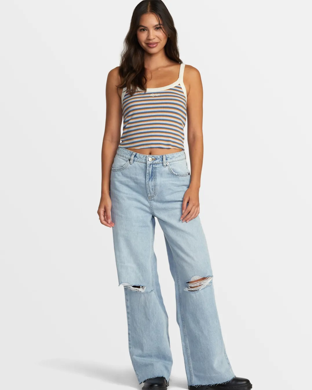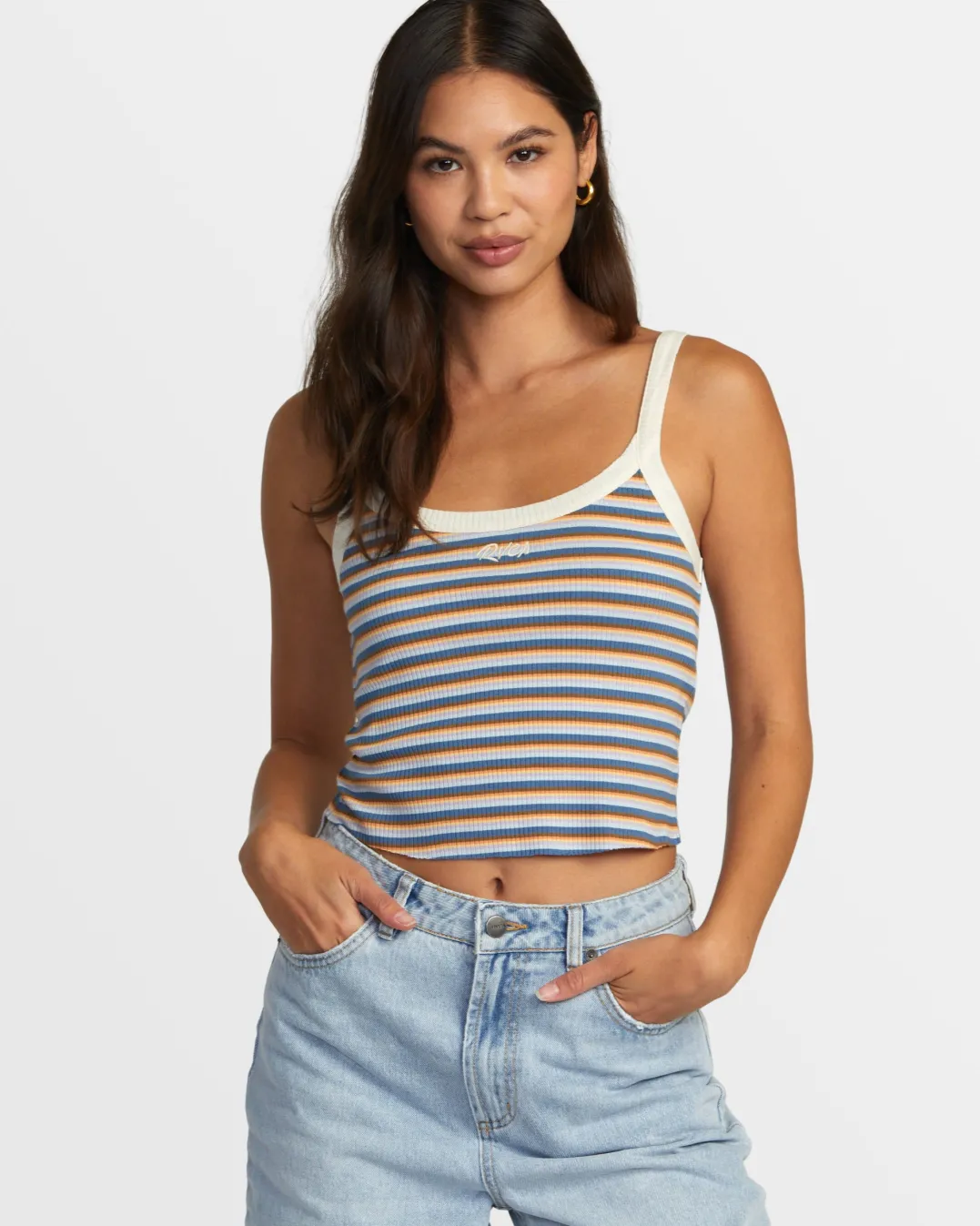 The Westside Crop Top from RVCA brings a sporty touch to your warm-weather basics. Crafted from a breathable viscose elastane blend fabric, this scoop neck cropped tank features fixed straps and an embroidered logo at the center front for a subtle brand statement. Featured here in the Multi colorway.
