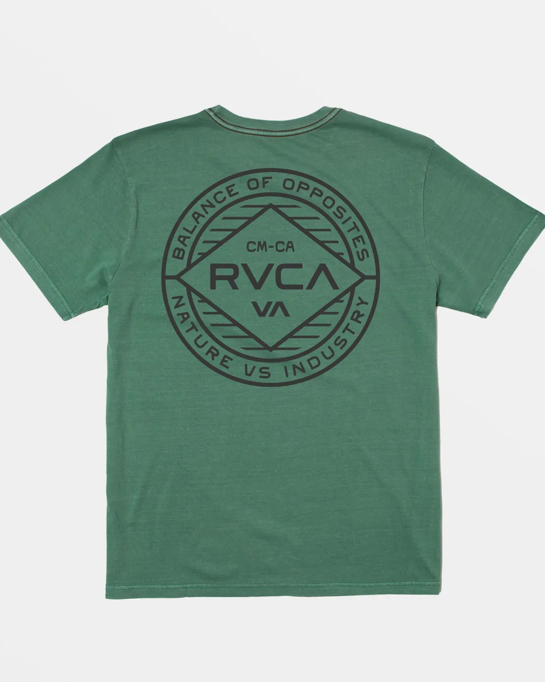 The Wordmarks slim-fit RVCA t-shirt has short sleeves and a crew neck for a classic look. Made from soft, lightweight cotton jersey fabric with a vintage wash and red stitch detailing, it features screen logo graphics on the front and back for an understated style. Featured here in the Spruce colorway.