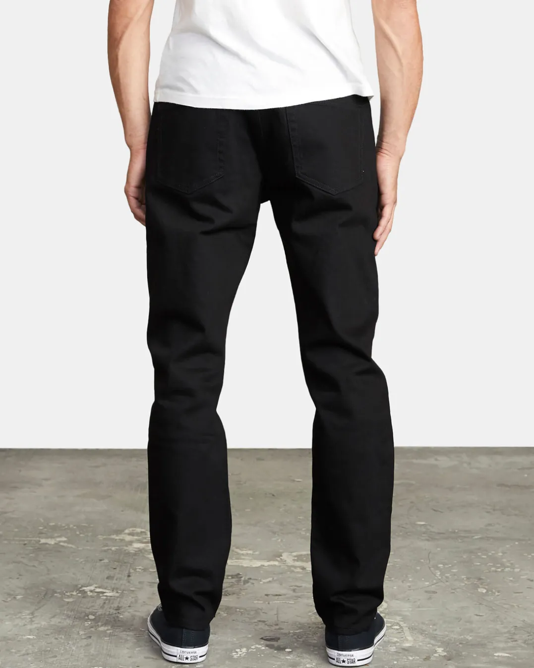 Heritage design meets modern comfort in the RVCA Daggers Denim Jeans. Made from soft cotton stretch, this mid-weight denim jeans feature a slim fit, with a front button tack and metal zipper closure, pockets throughout and RVCA logo branding. Featured here in the Black Black colorway.
