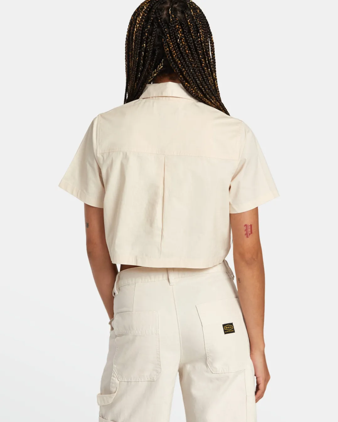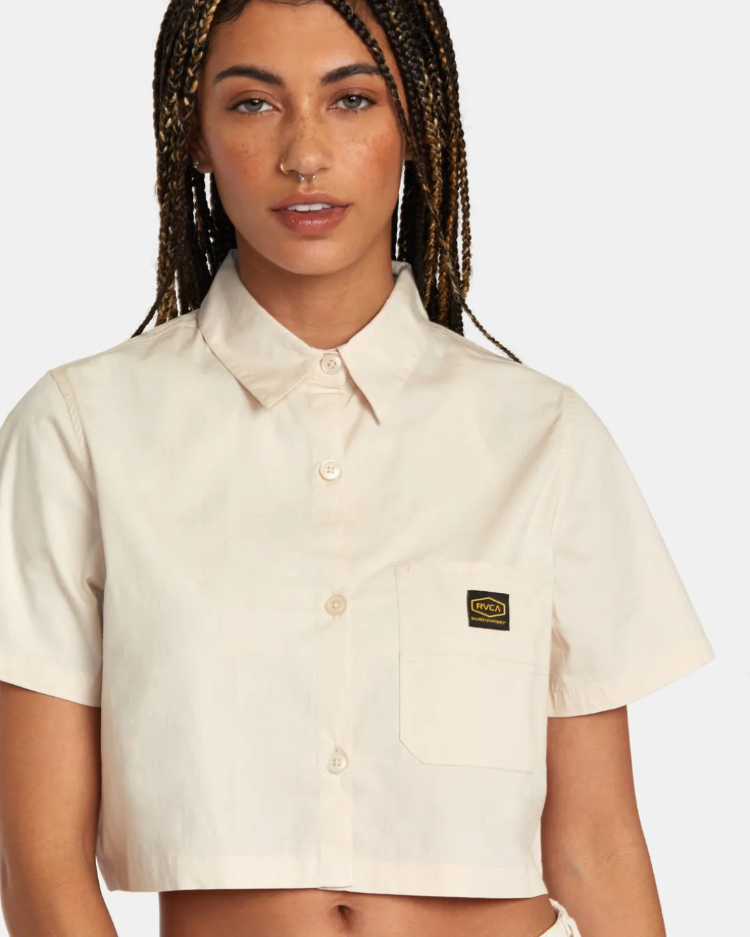 Business casual, with a modern edge. RVCA Women’s Dayshift Shirt updates the classic button-down with a cropped and boxy shape. Made of a blended cotton for a soft and breathable feel, this collared shirt features a chest pocket and woven label branding. Featured here in the Latte colorway.