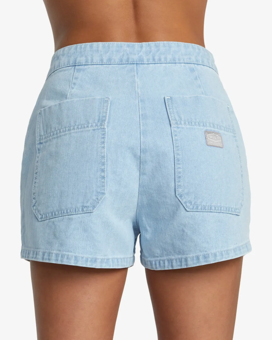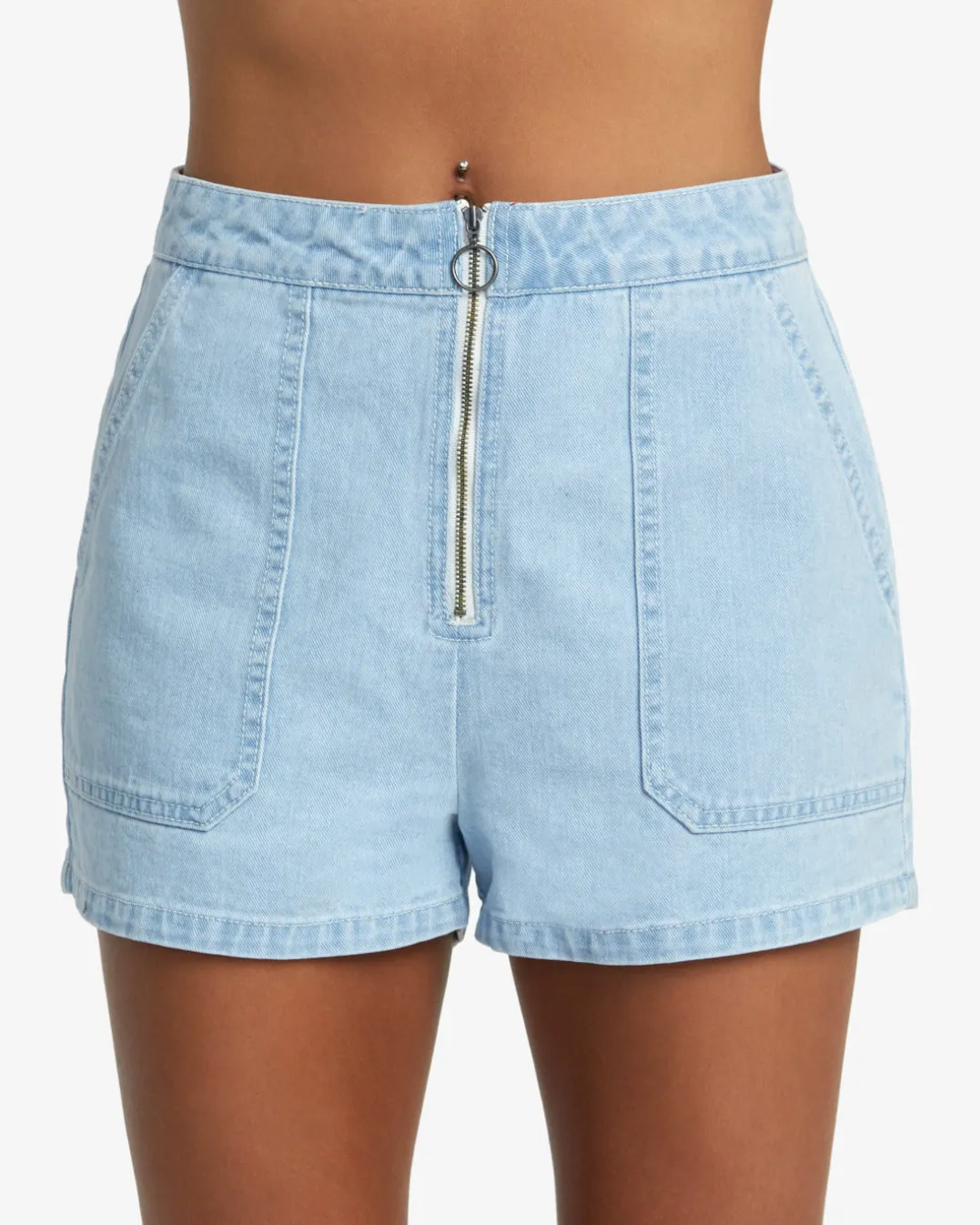 With a high-waisted fit and an O-ring zipper, the Goldie denim shorts have true vintage vibes. Complete with side and back pockets, they come in a light wash to top off the retro look. Featured here in the Light Vintage Wash colorway.