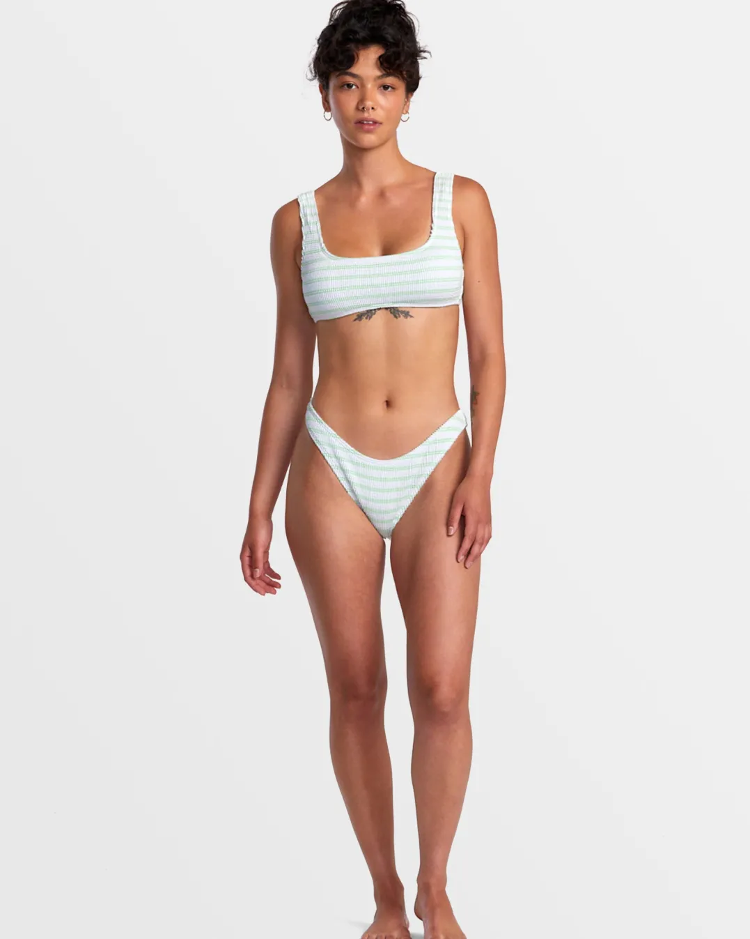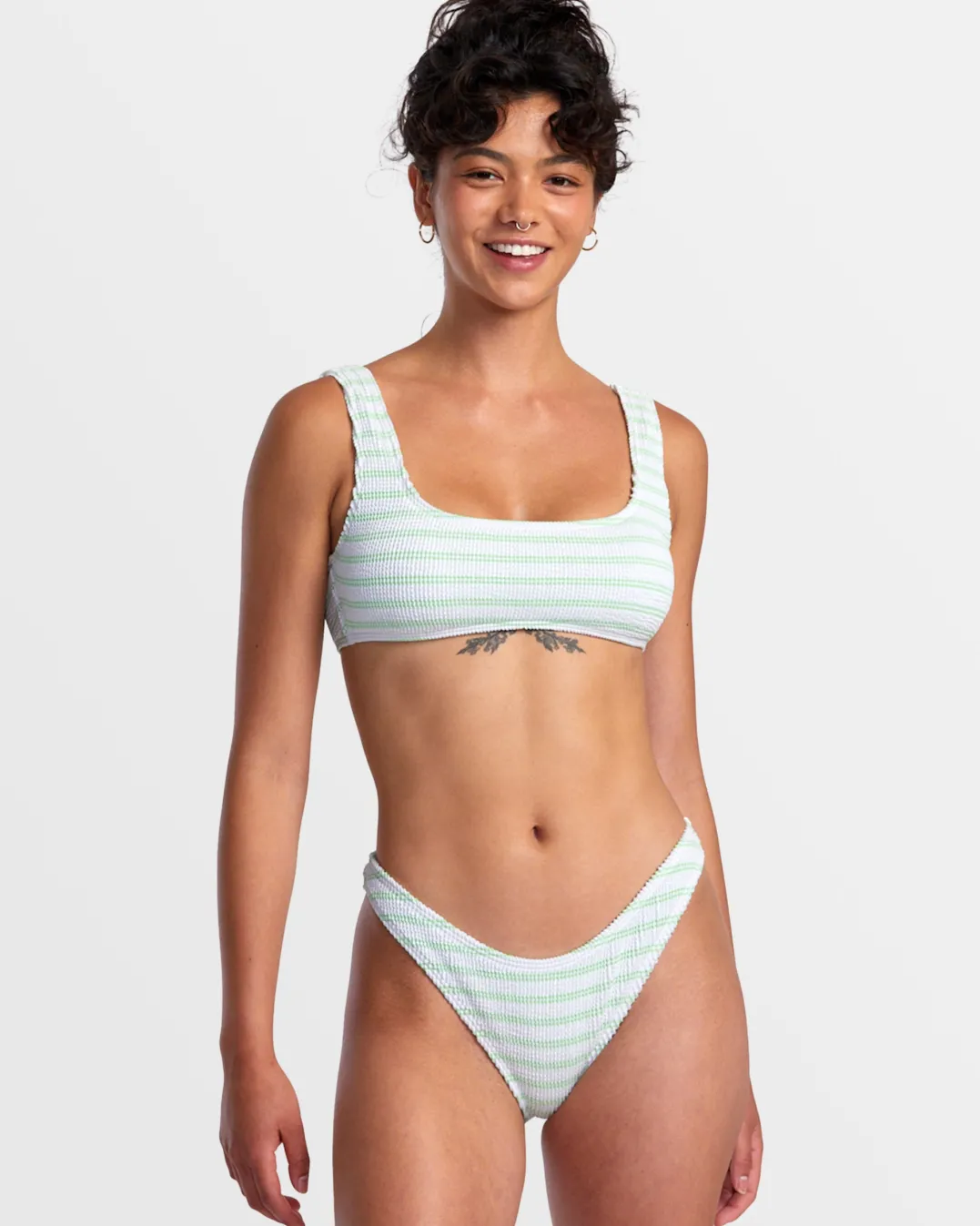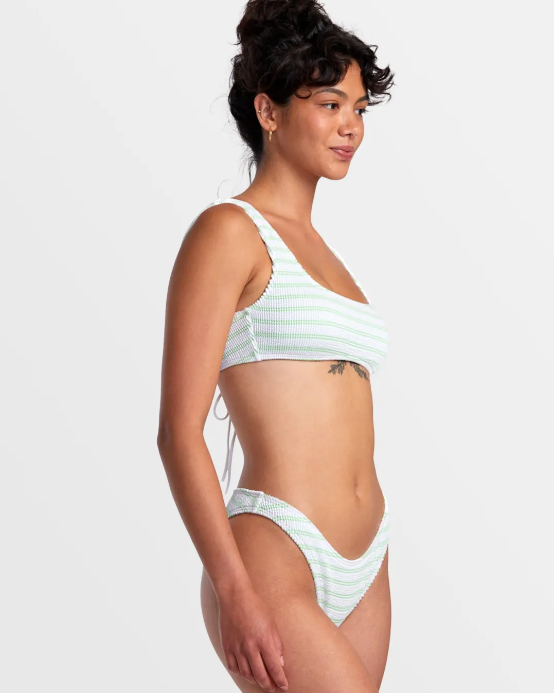 This medium-coverage bikini bottom from RVCA’s Grooves Stripe swim collection combines a high leg and a mid-rise waist. Best worn high on the hip to compliment your curves, it features a yarn-dyed stripe pattern on partially recycled texture fabric. Featured here in the Whisper White colorway.