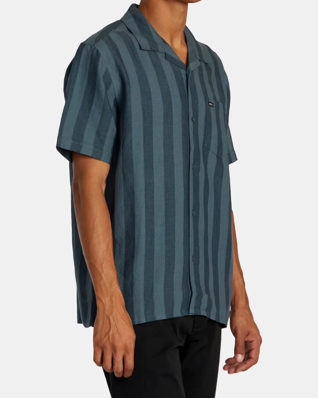 Elevate your wardrobe with the RVCA Love Stripe Short Sleeve Woven Shirt. Crafted from a lightweight linen-viscose blend fabric in a slightly relaxed fit for easy wear, this printed button-up shirt features a traditional collar neck, a single chest pocket, and a scalloped hem for an elevated look. Featured here in the Petrol Blue colorway.