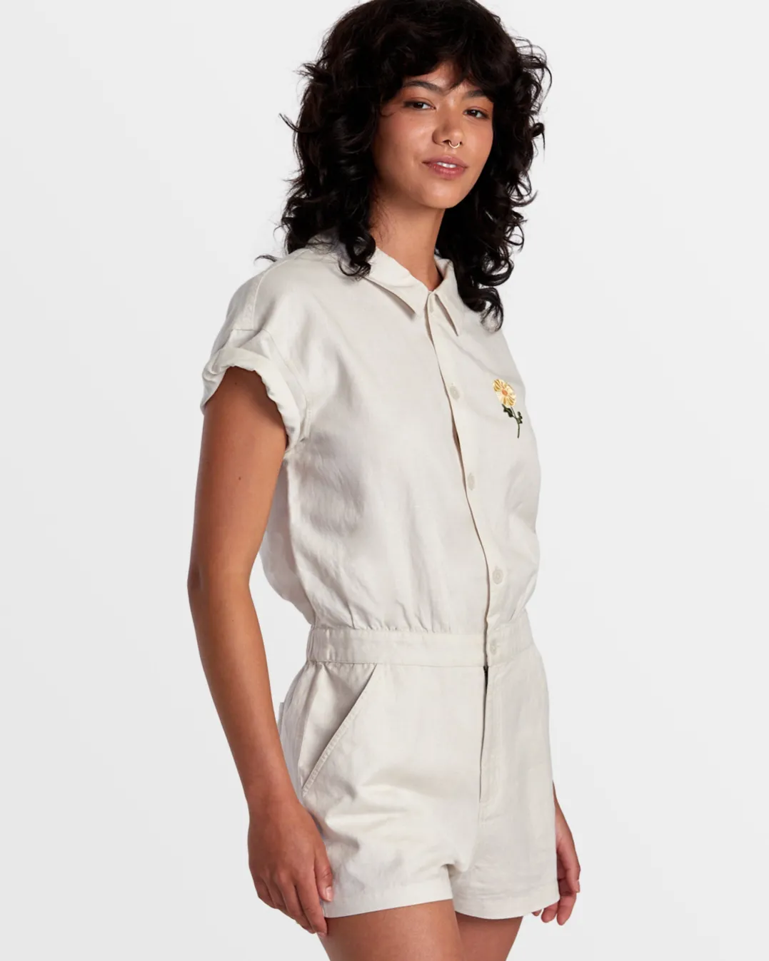 Made of airy linen, RVCA Women’s Maya Romper features a workwear-inspired silhouette with a collar neck, front buttons, and an elastic waistband to define your shape. Flower embroidery at the chest adds a feminine touch. Featured here in the Latte colorway.