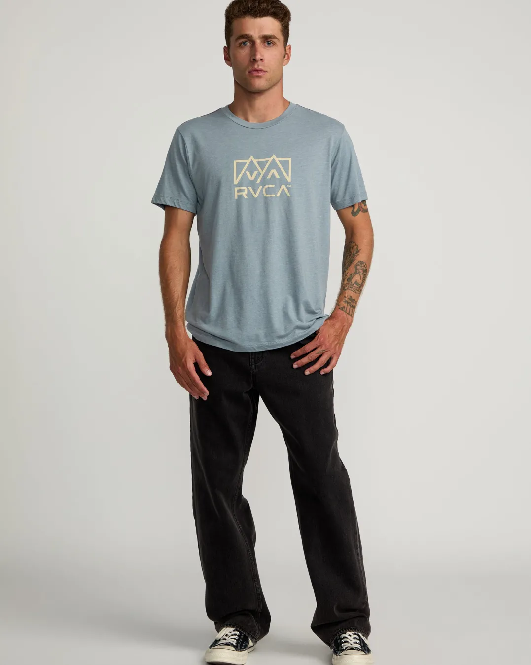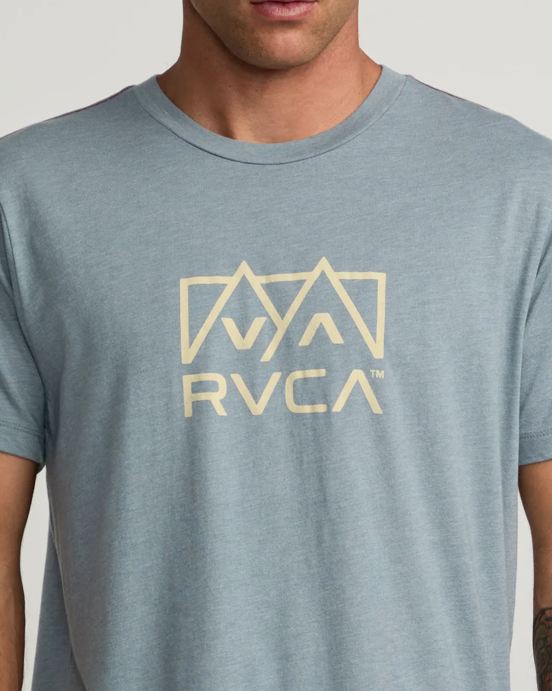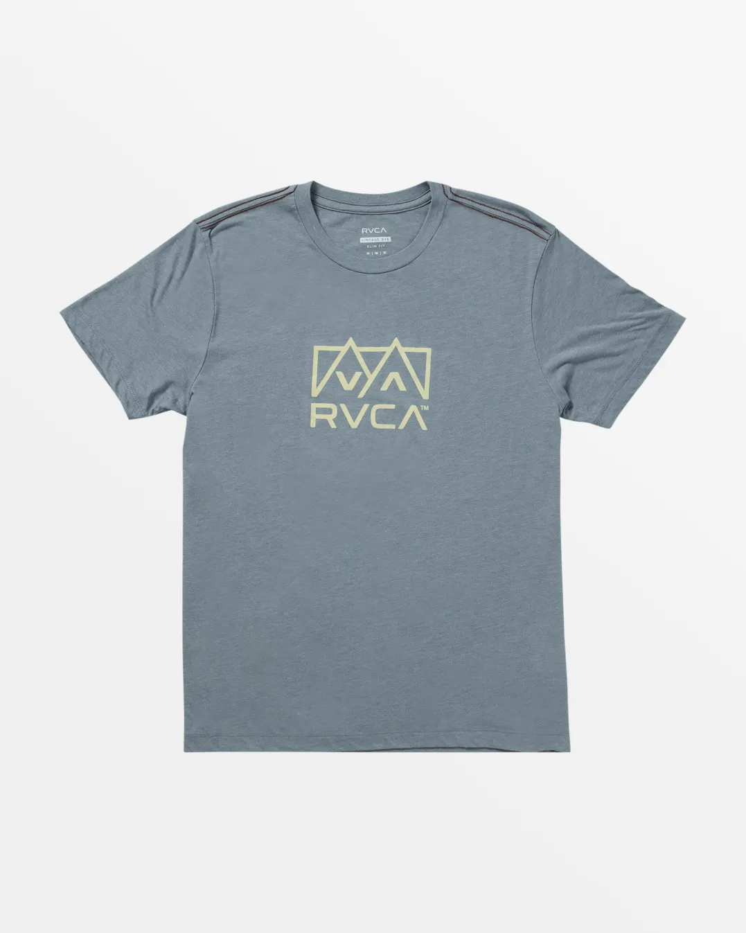 This vintage-washed cotton-poly tee boasts a slim fit and crew neck for an essential look that never goes out of style. Red stitching and a subtle front screen print add signature RVCA style. Featured here in the Flint Stone colorway.