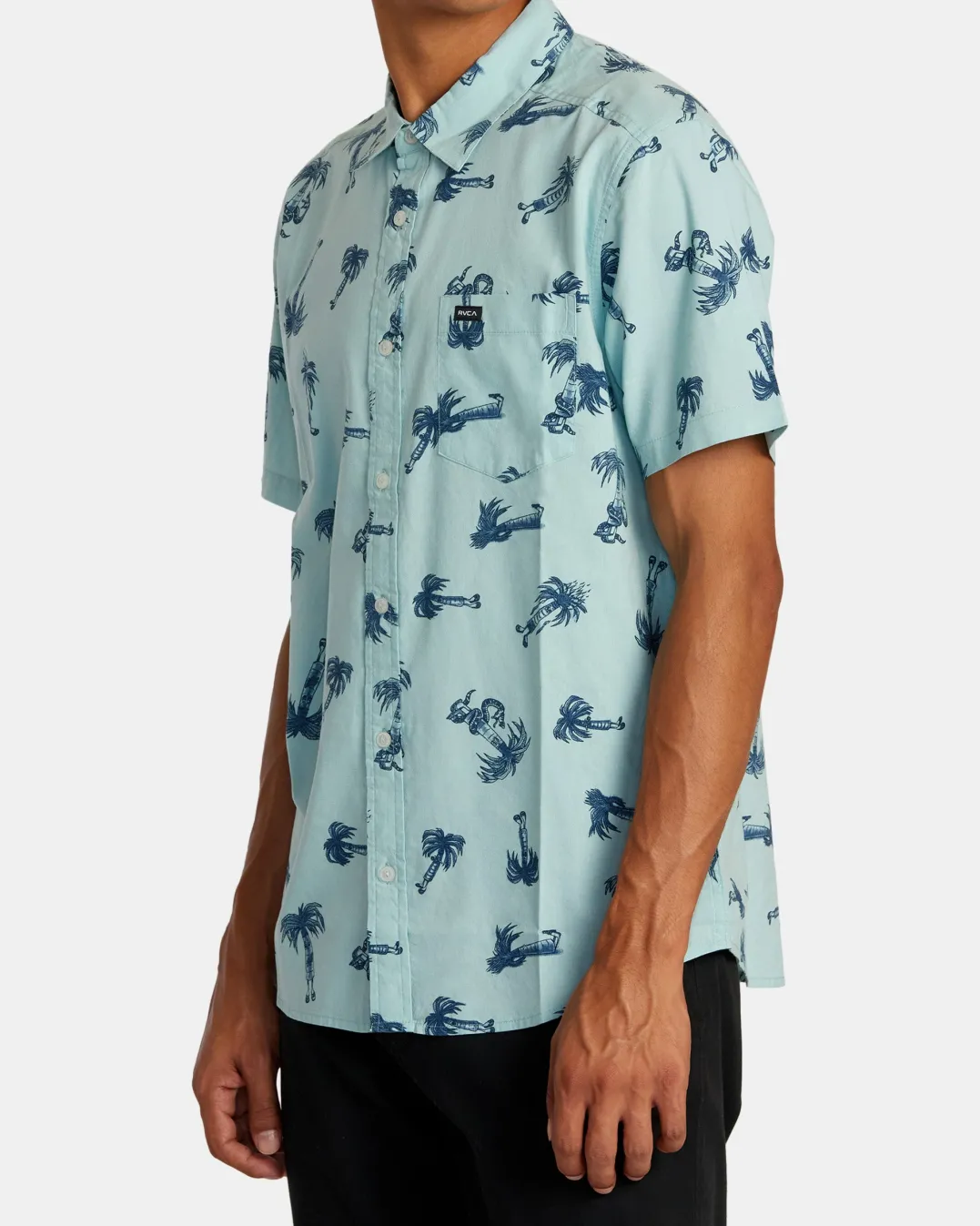 Part of the Andrew Pommier collection, this short-sleeved shirt boasts a custom ANP print that’s sure to turn heads. Styled with a chest pocket, button-up closure, and collar neckline, this shirt gives you vintage vibes with modern comfort thanks to its cotton viscose blend fabric. Featured here in the Blue Haze colorway.