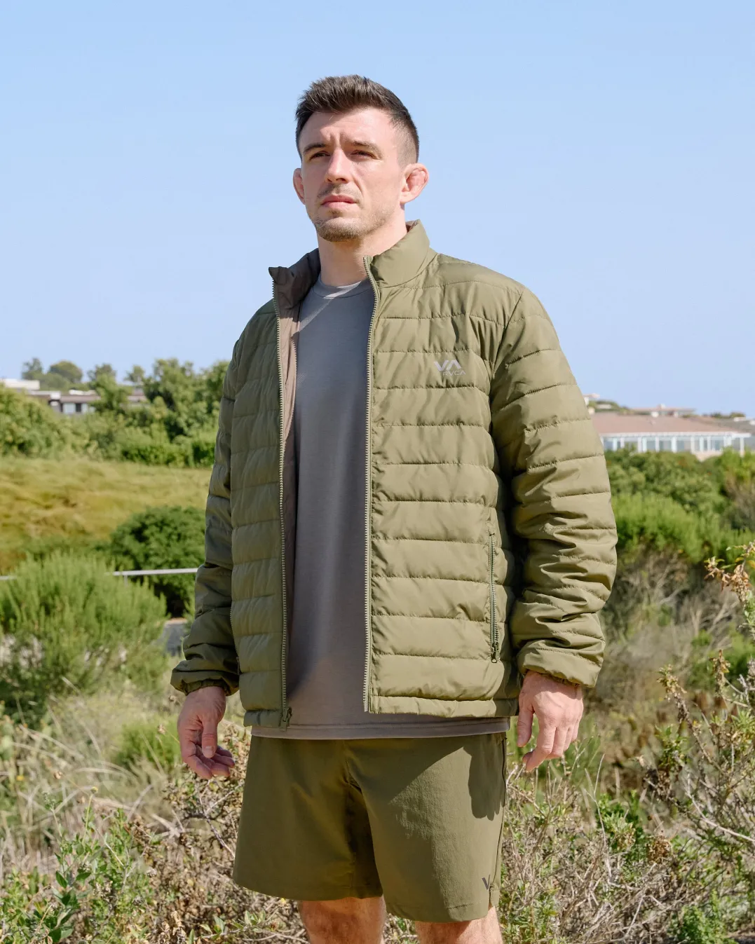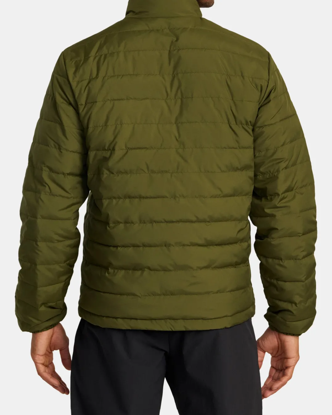 Double your outerwear options with this RVCA reversible puffer jacket. Crafted of durable poly, the mock neck design features a full zip closure and slanted pockets for added convenience. Featured here in the Olive colorway.