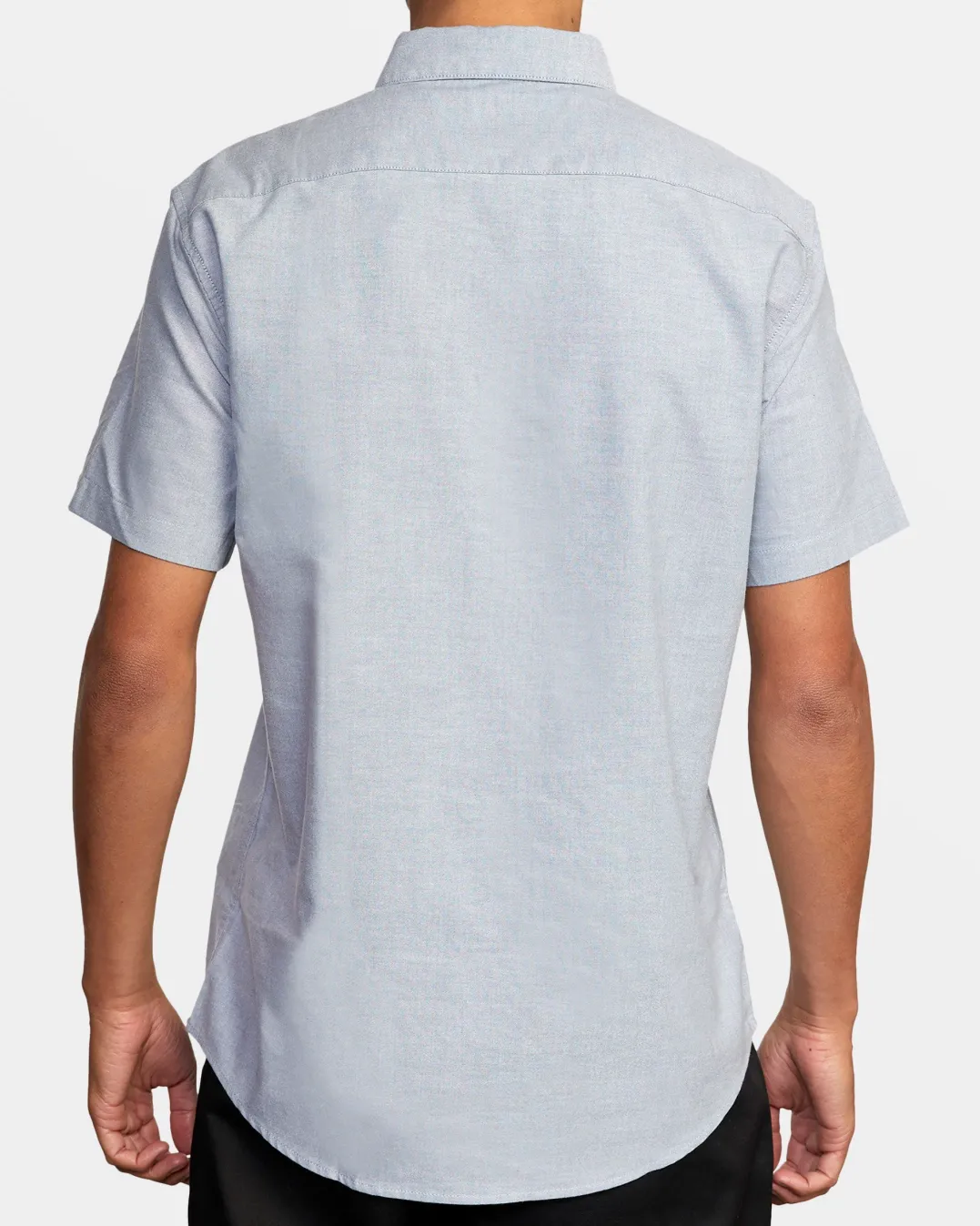 The RVCA That’ll Do shirt puts style and comfort in the game with a slim fit, stretch cotton blend, button down collar, and scalloped hem. Featured here in the Pavement colorway.