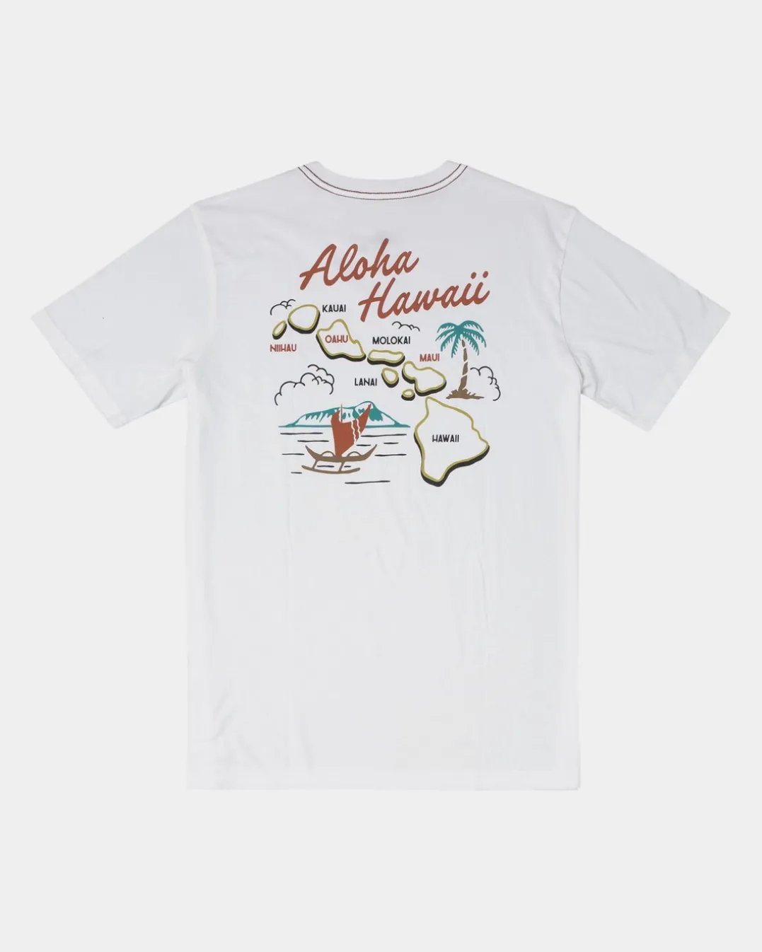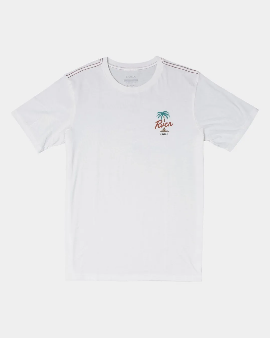 The RVCA Voyager Tee adds saltwater and signature design details to an essential men’s t-shirt. The men’s short sleeve t-shirt features RVCA Hawaii artwork printed at the chest and center back, continuing the custom feel with RVCA’s trademark red stitching at the shoulders. RVCA’s combed cotton tees for men deliver a soft hand feel and classic fit, finished with a screen printed neck label to maintain a comfortable feel. Featured here in the Antique White colorway.
