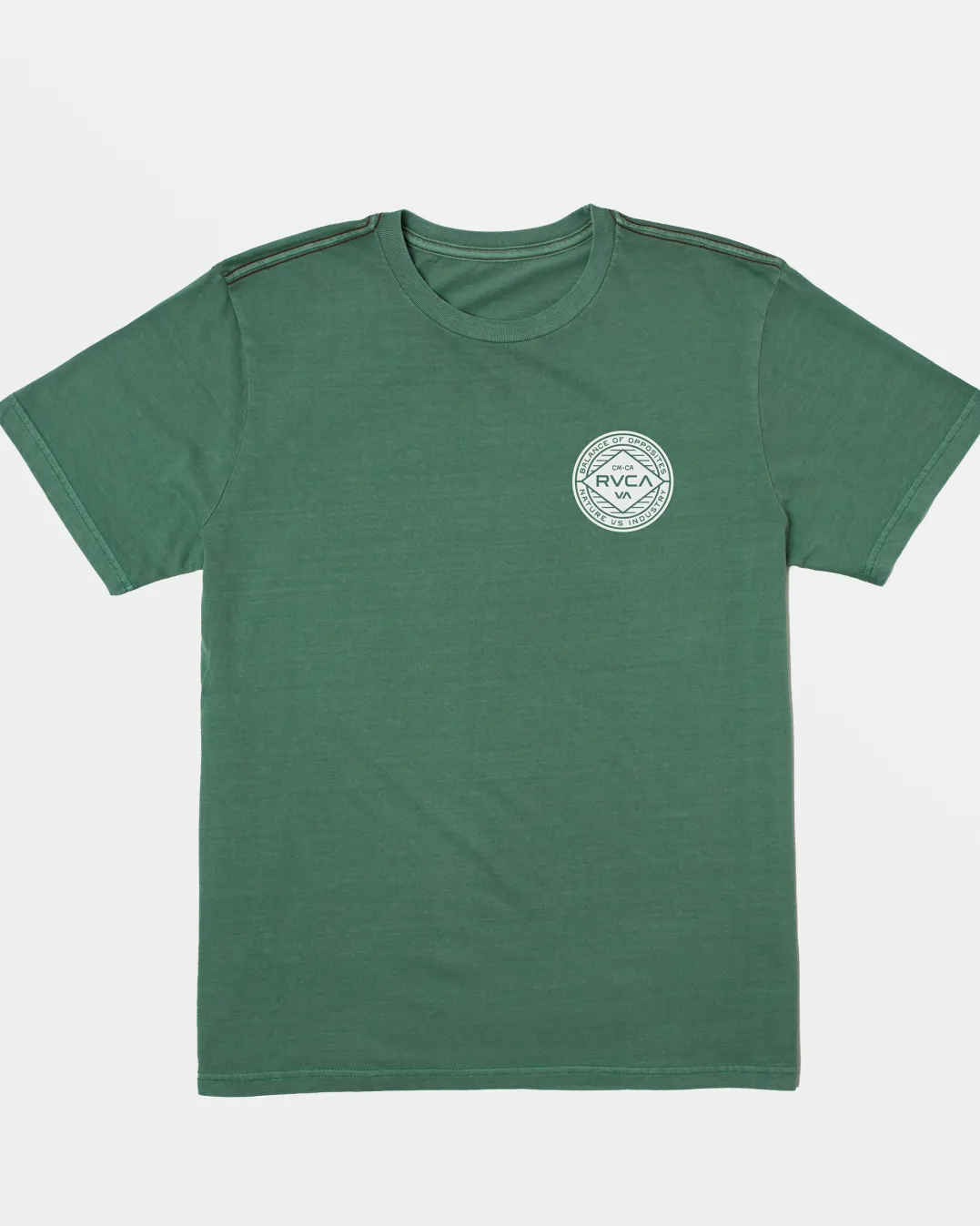 The Wordmarks slim-fit RVCA t-shirt has short sleeves and a crew neck for a classic look. Made from soft, lightweight cotton jersey fabric with a vintage wash and red stitch detailing, it features screen logo graphics on the front and back for an understated style. Featured here in the Spruce colorway.