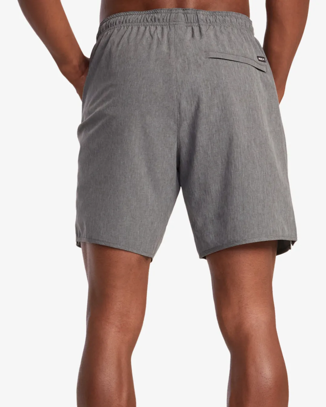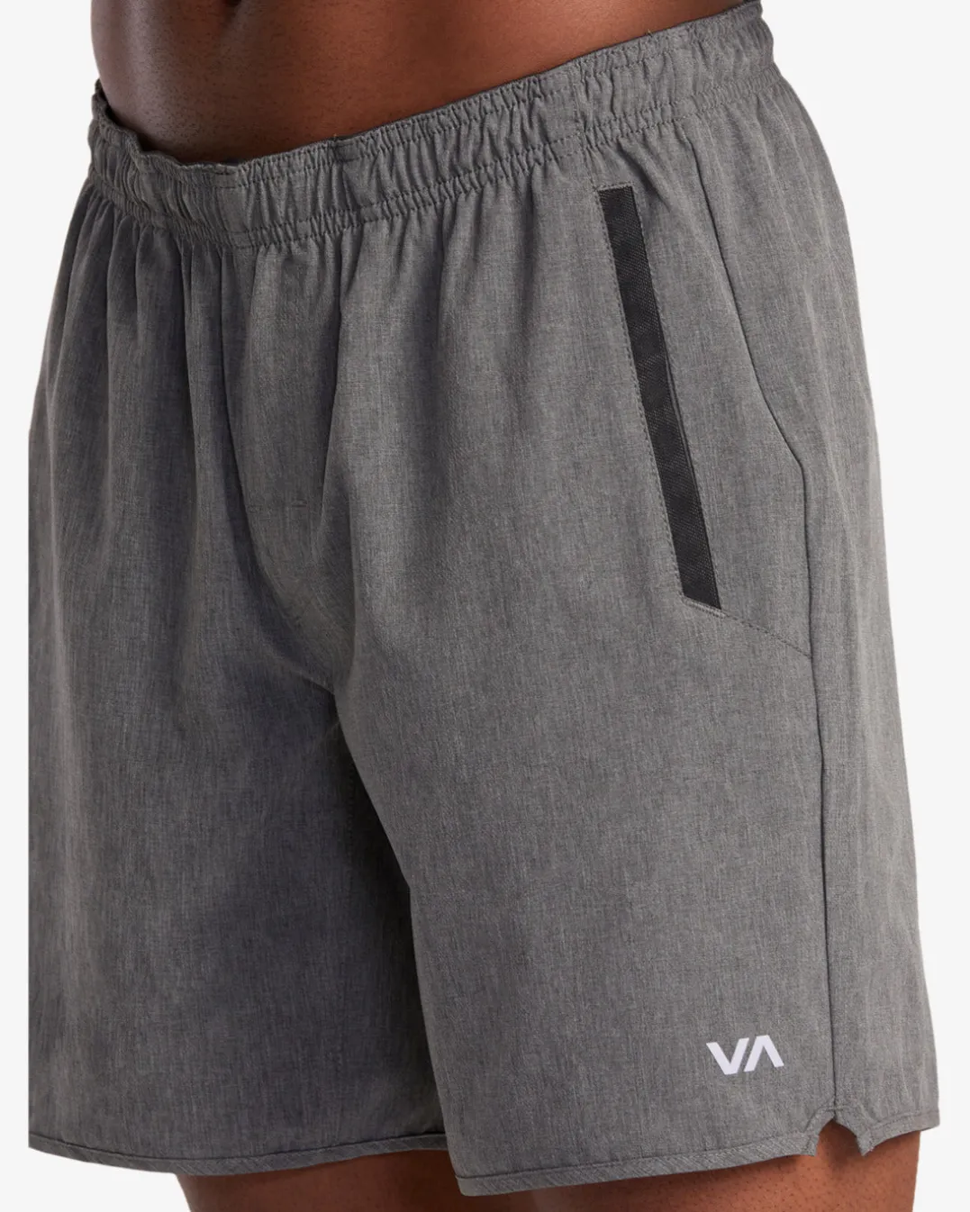 Combining heritage design and performance-enhancing comfort, the RVCA Yogger Stretch Elastic Waist Athletic Shorts 17″ have you covered. These men’s athletic shorts are made from stretch polyester and feature an Elastic Waist drawcord waist, slightly scalloped hem with split side vent and pockets throughout. Topped with RVCA VA branding. Featured here in the Charcoal Heather colorway.