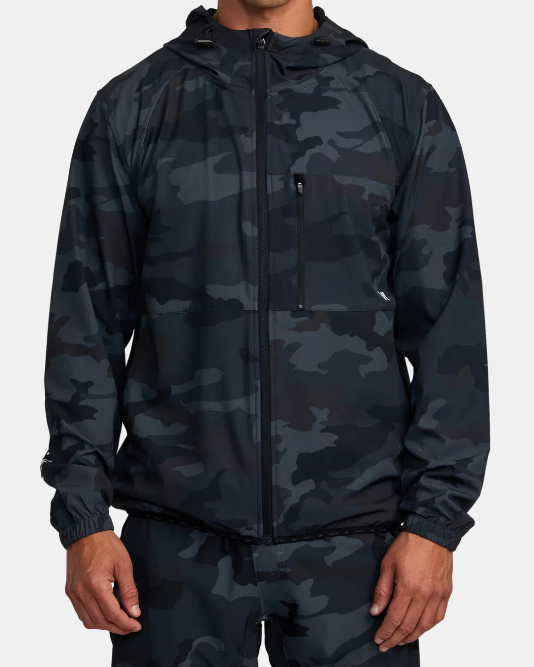 The RVCA Yogger Zip-Up Hooded Jacket II offers ultimate protection and style for days. Made from premium 4-Way Stretch, this men’s hooded jacket features a front zip closure, elastic hem and cuffs, adjustable toggles at the hood and pockets throughout for your needs. Topped with VA branding. Featured here in the Camo colorway.